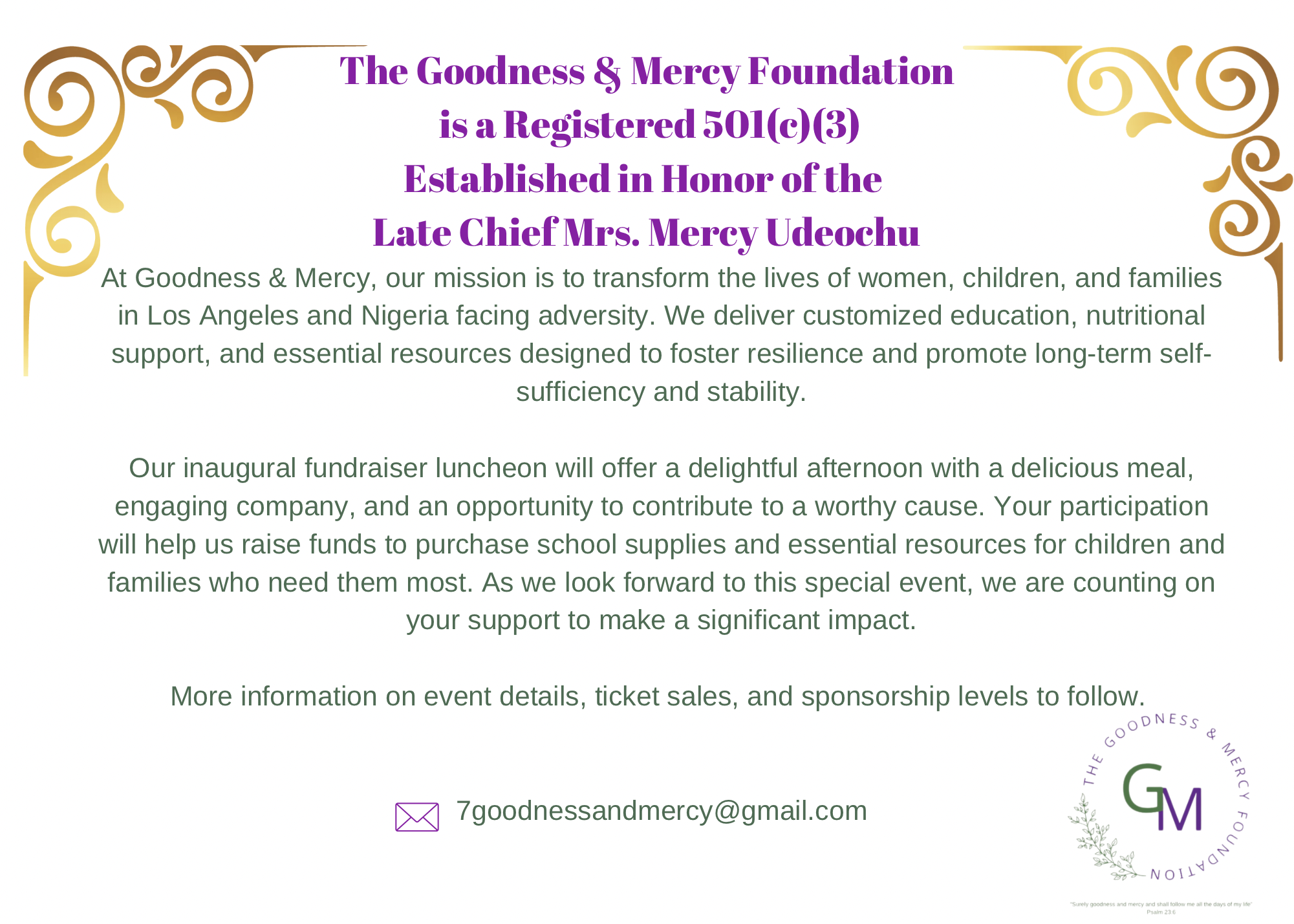 We want to express our heartfelt gratitude to our dear friends, family, and community for their unwavering support at our first-ever fundraiser luncheon for the Goodness and Mercy Foundation. Your overwhelming generosity through ticket purchases, donations, raffles, and auction items propelled us beyond our fundraising target, allowing us to raise above our goal! These funds will be instrumental in advancing our mission and perpetuating the incredible legacy of our mother, Chief Mrs. Mercy Udeochu.